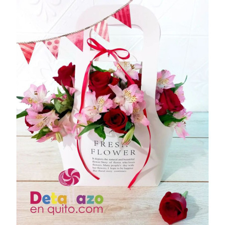 Rosas y astromelias en una caja de flores con diseño bolso.