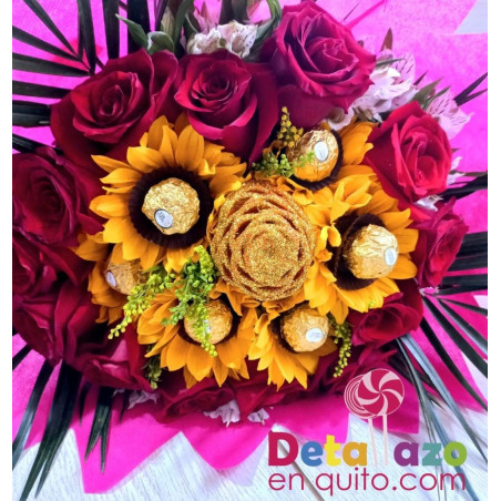 Un elegante ramo grande con rosas, girasoles y en cada girasol un chocolate ferrero.