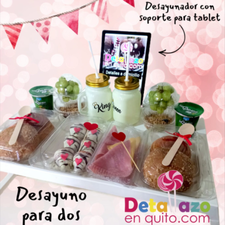 Desayunador para cama con patas movibles con soporte para tablet, 2 mug de vidrio con bebida soft, 2 porciones de pan, 2 porciones de jamón y queso, 2 yogurt, 2 porciones de fruta fresca, 2 porciones de granola y una porción de fresas bañadas en chocolate.