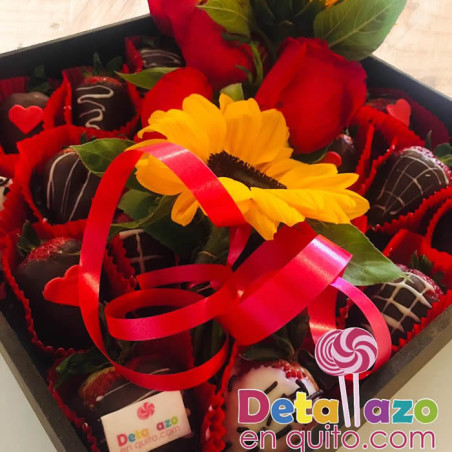 Fresas bañadas en chocolate semi amargo y chocolate blanco con diferentes diseños, acompañadas de 2 girasoles y 3 rosas.