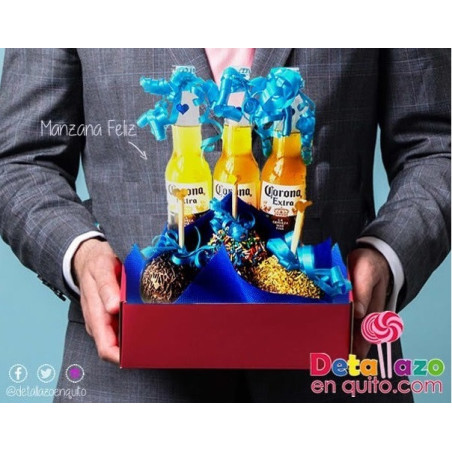 3 manzanas bañadas en chocolate con diferentes coberturas, 3 cervezas corona.