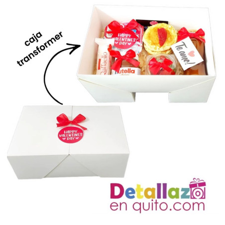 Una caja genial que se transforma en una mesita, contiene pancakes con jalea de mapple, capuccino, alpinette, fresas con nutella y un pack de chocolates Rafaello.