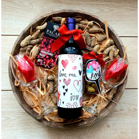 Como base un cuadro redondo estilo cava de madera rústico, con vino tinto de 950ml, 2 copas de cristal y una barra de chocolate fino de aroma.