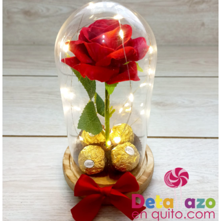 Una rosa 🌹 en un domo de vidrio con base de madera (Tamaño 20 x 10 cm), decorado con luces hada ✨️ y 4 chocolates ferrero.
