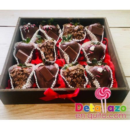 Caja de madera con 12 fresas bañadas en chocolate semi amargo con detalles en chocolate.