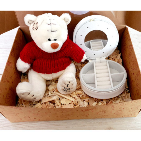 Un hermoso joyero impreso con tu frase o foto favorita y un tierno osito de peluche con sweter tejido.