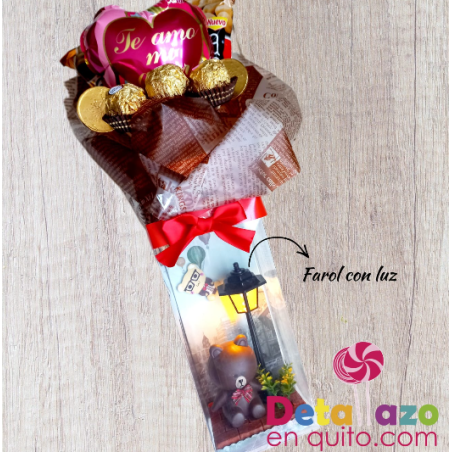 Un hermoso detalle de dulces con una mini lámpara de escritorio estilo farol con luz cálida, personaliza el fondo con tu collage de fotos.
