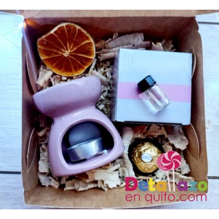 Un pequeño detalle que contiene un difusor de aroma, viene con su escencia y 2 velas pequeñas, decorado con frutas secas para aromatizar.