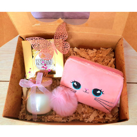 Buscas un detalle tendencia "Coquette" una billetera diseño de gato, una vela aromática decorada con lazo y una caja de chocolates ferrero.