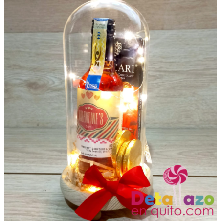 Un domo de vidrio con vino pequeño, un chocolate de pétalo de rosas y 3 monedas de chocolate, detalle decorado con luces hada ✨️.