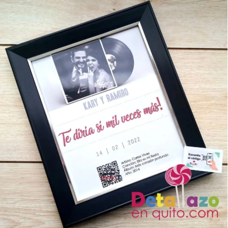 Un cuadro personalizado con código QR que te llevará a un video hecho con tus fotos y cancion favorita, cada vez que scannees el código podrás ver una y otra vez tu video.