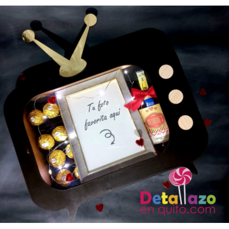 Una caja de madera con diseño de TV, luces hada, un portaretrato con tu foto o frase favorita, 1 botella de 250g y 8 chocolates ferrero